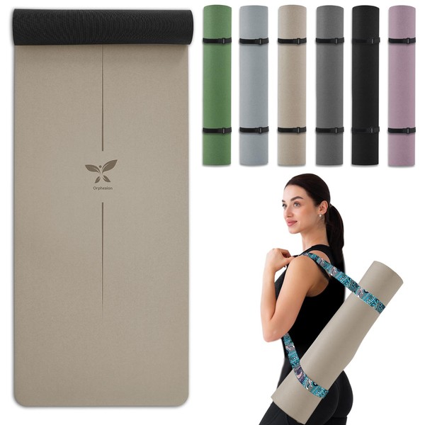 Orphesion Professional Yoga Mat with Carry Strap,Non-Slip Eco-Friendly Natural Rubber Mat Superior Grip Durable 72"x26"Large Mat 5mm Thick Ideal Exercise Mat for Home Workout,Gym and Outdoor (Light Taupe)