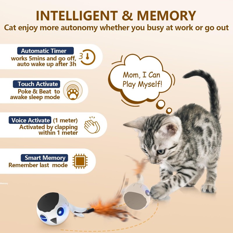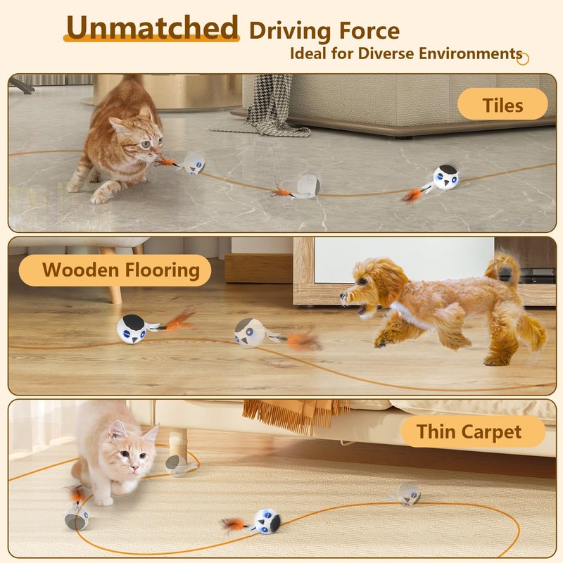 - 🐥CAT AFTER MOUSE GAME: Interactive cat toys ball with a teaser feather tail is shaken or swung in front of the cat, imitate the random movement of small animals, emit sounds and LED flashing attract cats' attention, prompting cats to chase, jump and run. let cats experience a "natural" game, enhance the sense of reality and satisfaction. Through fast and random movements, helping cats consume excess energy and stay energetic and healthy.