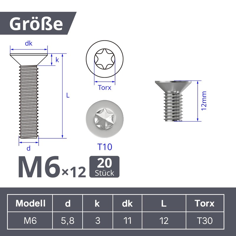 ORTAVA ORTAVA 20 Stck Senkkopfschrauben M6 x 12 mm, M6 Senkkopfschrauben Torx Edelstahl 304, Senkkopfschraube mit Innensechsrund/Torx (ISR/TX) nach Norm ISO 14581 / DIN 965, fr Maschinen, Ger?te und M?bel