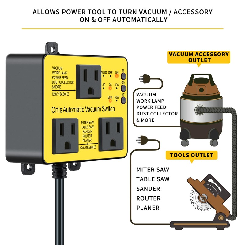 Automatic Vacuum Switch with Extra Outlet for Using More Power Tools, Ortis Dust Control Autoswitch Delay Vacuum On/Off to Prevent Circuit Overload and Tripping, Adjustable Actuation Threshold, Yellow