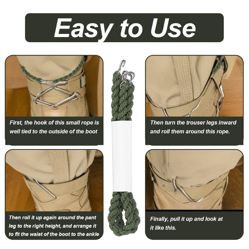 - [Easy to Use]: Featuring sturdy metal hooks, these elastic boot bands twists leg ties are simple to fasten, keeping sand, dirt, bugs, and insects out of your boots.