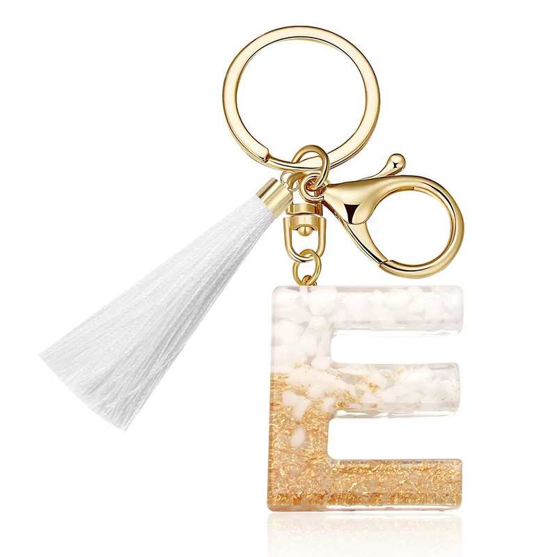 ORUZA Alphabet Initial Letter Keychain, White Gold Foil Initial Letter Keyring with Sequins Resin Alphabet Key Ring for Women Wallet Purses (E)