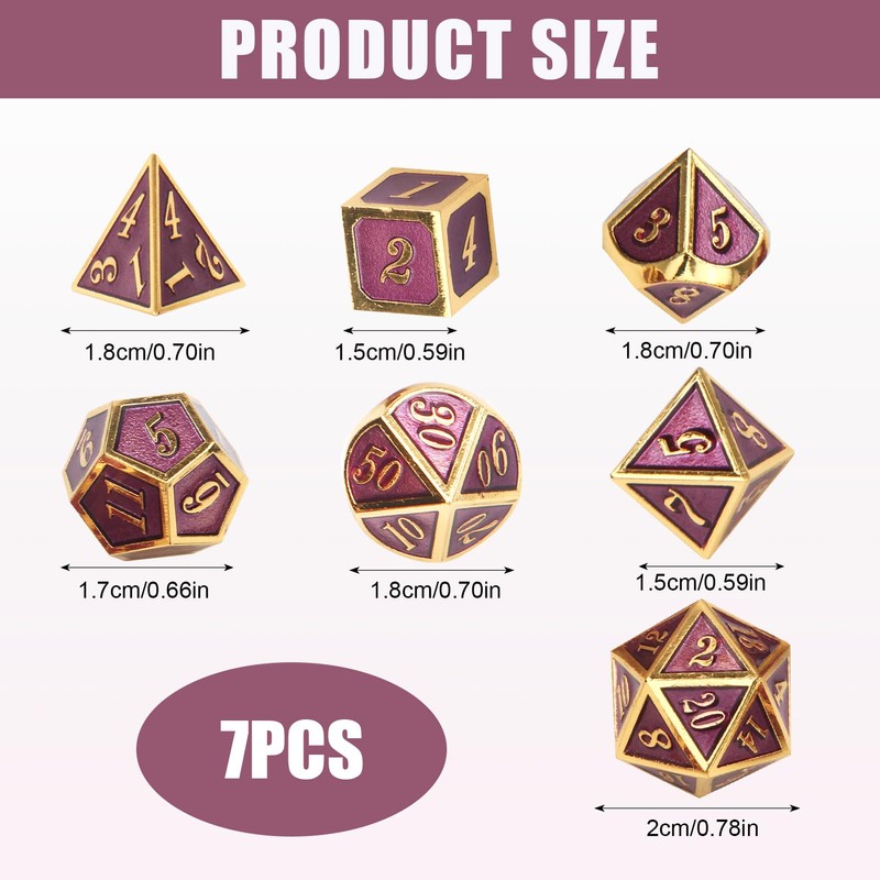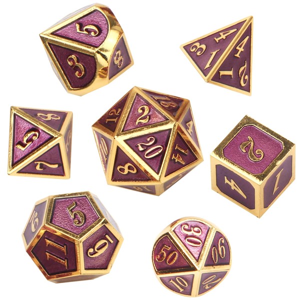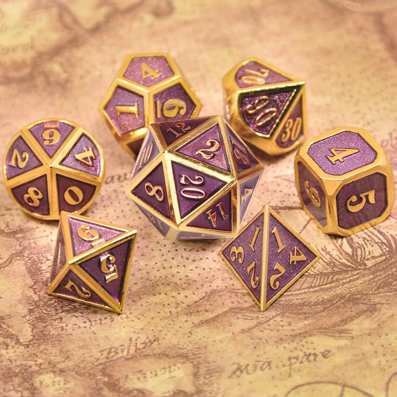- DND metal dice set: gold-coloured edges and a purple enamel coating make this dice set extremely attractive, metal dice set including D4, D6, D8, D10, D12, D20 and D%, are equipped as a set of 7 perfect for any game type