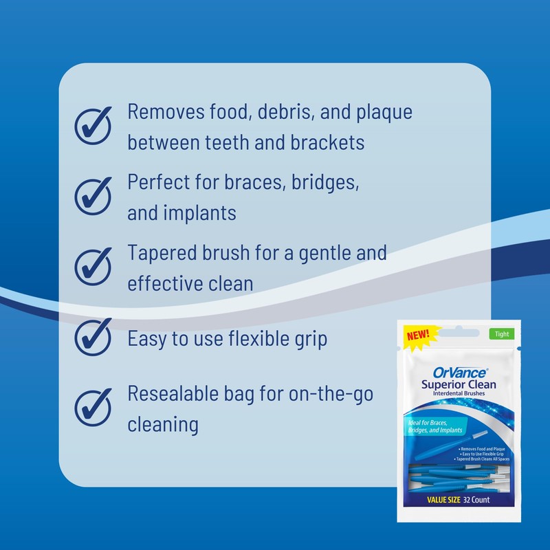 Superior Clean Interdental Brush from OrVance is the flossing-alternative solution for those with braces, bridges, and implants. The tapered brush design gently and easily glides between brackets, teeth, and dental appliances to effectively clean the tight and hard to reach spaces in the mouth. The soft grip, flexible handle allows for a reliable and comfortable grip for accessing all angles of the mouth as you clean and the soft coating helps provide a better grip in wet conditions. Superior Clean is designed to remove food particles, debris, and plaque from areas that toothbrushing alone can’t reach, helping to prevent tooth decay and bad breath and helping you feel confident in your smile. Our interdental brushes also come in a resealable bag for convenient on-the-go use to fit into any busy lifestyle. Use them at home, in the office, at school, in the car…wherever you go, Superior Clean can go, too! Using Superior Clean Interdental Brush as a flossing alternative is easy! Gently insert the tapered floss brush between your teeth or dental appliance spaces and gently move the brush back and forth to dislodge food and debris that has collected between the teeth or braces brackets. That’s all it takes to get a fresh clean anywhere, any time. Keeping your teeth clean and debris free has never been easier with Superior Clean Interdental Brush from OrVance!