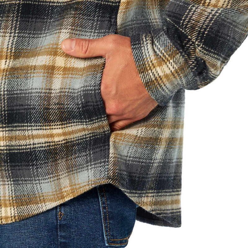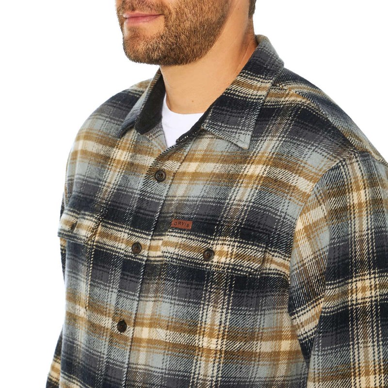 • Orvis patch on left chest Brushed fabric inside cuffs and collar Buttoned cuffs Spread Collar Two Chest Pockets With Buttoned Flaps Two Side Seam Pockets