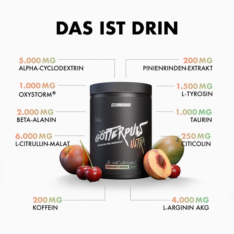 - ✅ Kaffeine fat: Citicolin - The focus matrix of the Götterpuls Ultra consists of caffeine and citicolin. The latter ingredient is dosed at 250 mg per serving.