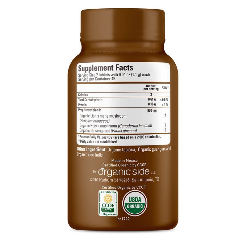OS Organic Side - Lion's Mane, Reishi & Ginseng 100% Pure Organic 90 Tablets - Adaptogens - Certified USDA - Non GMO - Plant-Based