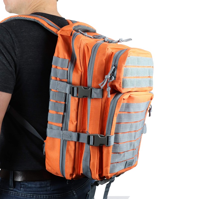 • MOLLE webbing can store pliers and other tools for quick access; backpack dimensions are 18 inches long, 12.5 inches wide, and 9.5 inches deep, constructed with durable 600D ballistic nylon