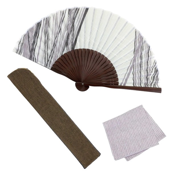 Osaka Choseido Folding Fan, Men's, Stylish, Business, Fan Bag, Handkerchief Included, Set with Kudzushi Cool Pattern, Scale Print, brush stripe white