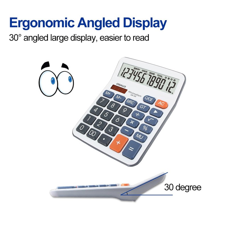 • Extra Large Display & Large Button:When you put the calculator on the desktop,the 30° large display is just opposite your sight,more clear than a horizontal display. Big size and soft sense of press button make your every press more accurate and relaxed,work more efficient.