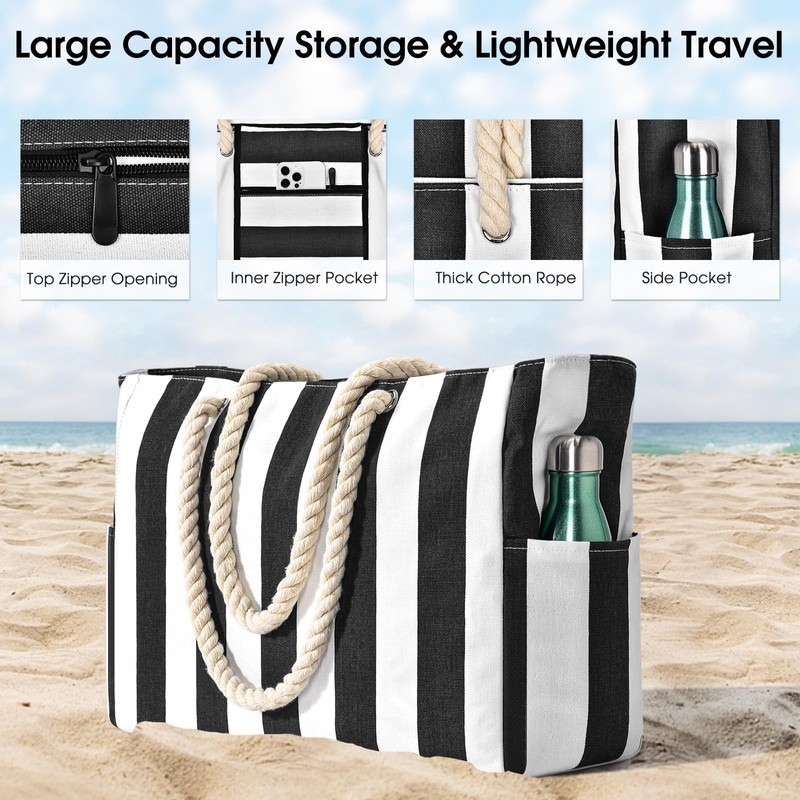 - Beach Bag With Zipper - The beach bag includes a large zippered main compartment and a zippered inside pocket. The zippered inner pocket is great for holding your cell phone, wallet, power bank, etc.