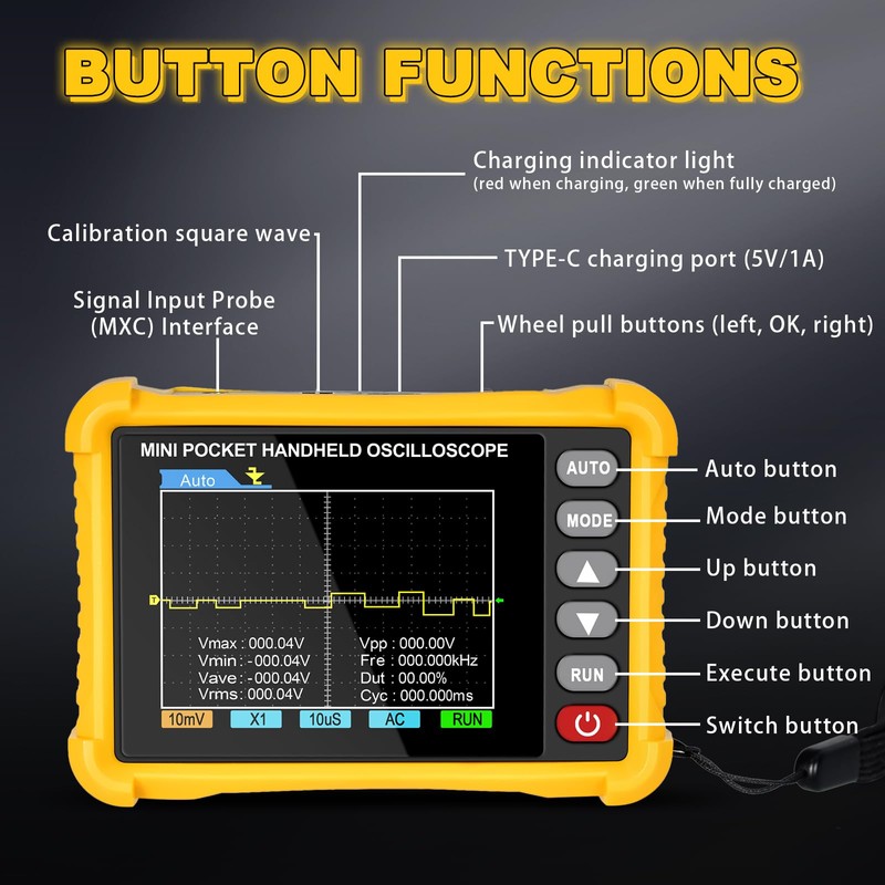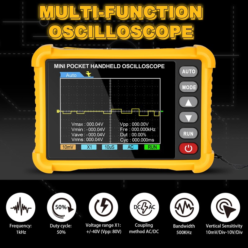 - Oscilloscope handheld with fast scanning: 500K miniature oscilloscope has a real-time sampling rate of 2.5 MS/s, a bandwidth of 500 KHz, a voltage range of X1: ±40V (Vpp: 80V), X10:±400V (Vpp:800V), a calibrated rectangular frequency of 1kHz and a button. 50 %