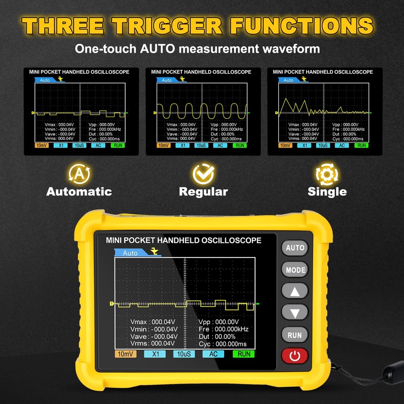 - Advanced Triggering and Display: full trigger functions (one-time/regular/automatic) work with both periodic analog signals and non-periodic digital signals, and this digital oscilloscope features a 2.8 inch high-definition LCD display with a resolution of 320*240 for easy viewing
