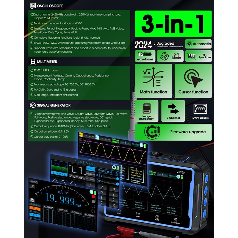 Oscilloscope Multimeter 2 Channel, WapoRich 3 in 1 Tablet Signal Generator Oscilloscope with 50MHz, 250 MSa/s, 12 Signal Waveforms, TRMS 19999 Counts, 64KB Storage Depth, Online Update