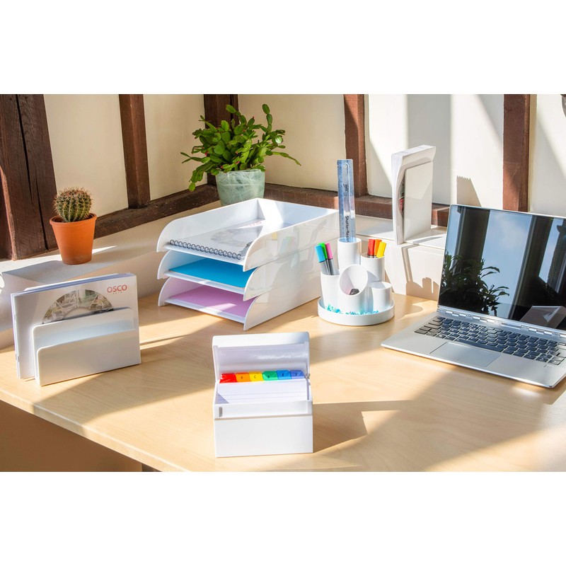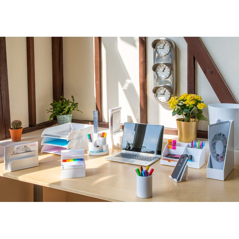 - Why not check out the other eight products in this range of clean, crisp and elegant, white plastic desk accessories from OSCO - a unique and contemporary collection of office storage products created from high grade, thick, shiny white plastic. Transforms traditional utility products into fashionable essentials to enhance your office and home