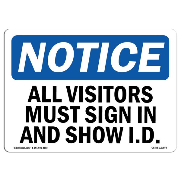 OSHA Notice Sign - NOTICE All Visitors Must Sign In And Show I.D. | Vinyl Label Decal | Protect Your Business, Construction Site | Made in the USA, 7" X 5" Decal