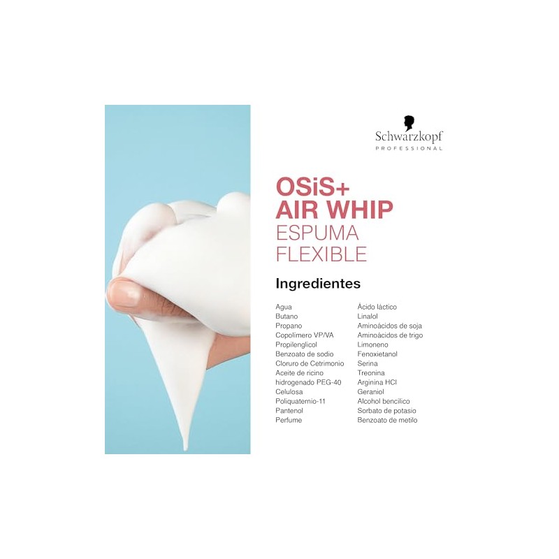 - Air Whip Espuma 200 ml. OSiS Air Whip es una espuma flexible de fijación ligera que mejora la manejabilidad del cabello durante el secado y lo protege de los daños causados por el calor. Puede aplicarse en capas para aumentar la fijación sin apelmazar ni aplastar el cabello. La Espuma Osis+ Air Whip de Schwarzkopf Professional es tu aliado perfecto para lograr peinados con volumen y cuerpo sin comprometer la suavidad y flexibilidad de tu cabello. Con una fórmula innovadora, esta espuma ligera y aireada proporciona una fijación flexible y duradera, permitiéndote crear estilos con movimiento y textura. Gracias a sus agentes acondicionadores, protege tu cabello del calor de las herramientas térmicas y lo mantiene hidratado y suave. Ideal para todo tipo de cabello, esta espuma es la clave para un look impecable con un toque de volumen y frescura. ¡Cabello voluminoso y manejable! Perfecto para volumen, cuerpo y sensación de cabello hidratado. Ideal para clientes que buscan una fijación ligera y volumen. Beneficios: Fijación ligera y flexible, sensación de cabello hidratado y suave, volumen modulable para una mayor fijación, fórmula de fortalecimiento y cuidado, y protección térmica hasta 230°C. Modo de empleo: Agita bien el producto antes de usar. Mantén el envase boca abajo mientras lo aplicas. Distribuye la espuma sobre el cabello húmedo. Seca con secador para un estilo voluminoso o deja secar al aire para definir ondas. Aplica por capas para aumentar la fijación. OSiS ofrece una amplia gama de productos de acabado para fijar estilos en una posición determinada o evitar que se deshagan o muevan. Descubre los estilos con carácter. Defendemos la autoexpresión sin restricciones y la creación de estilos a tu manera. El poder de tu personalidad no tiene límites y nuestros productos tampoco. OSiS se adapta a ti y a tu cabello para que des rienda suelta a tu creatividad sin importar tu estado de ánimo. Una fijación lista para todo tipo de personas, estés donde estés. OSis es una marca que pertenece a Schwarzkopf Professional.