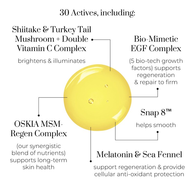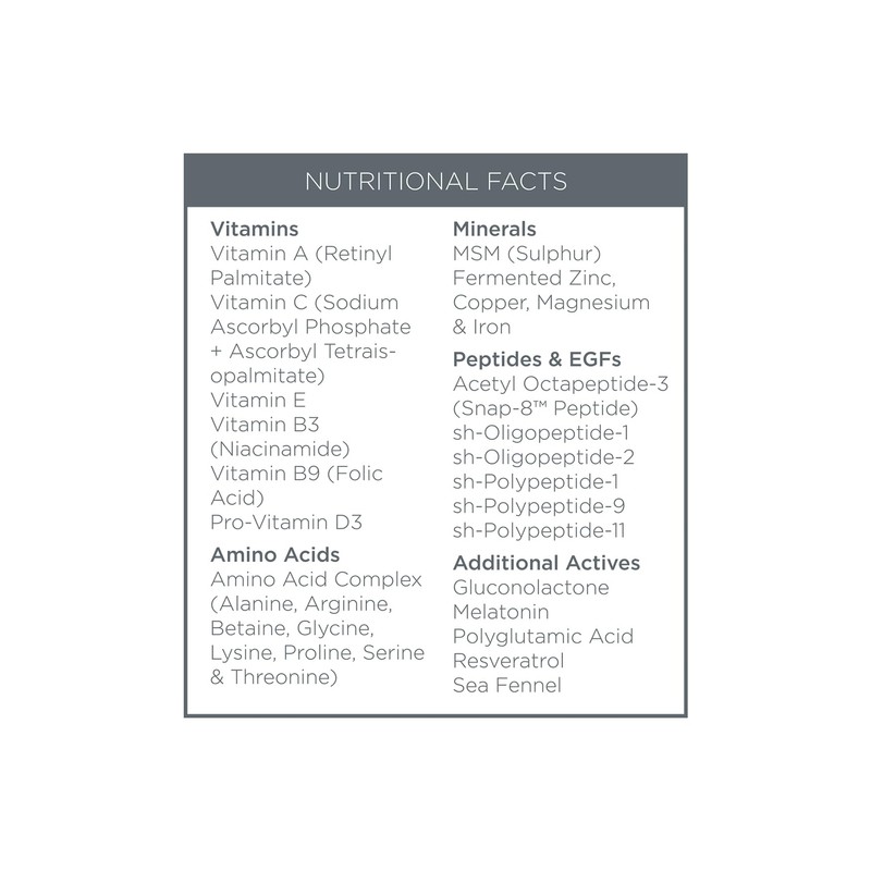 - 30 actives including: Bio Mimetic EGF Complex (Five bio-tech growth factors-EGF, IGF-1, Acidic FGF, BasicFGF, VEGF-plus Vitamin B9 & Acetylated Glutamine), supports natural regeneration and repair,instantly calms. .