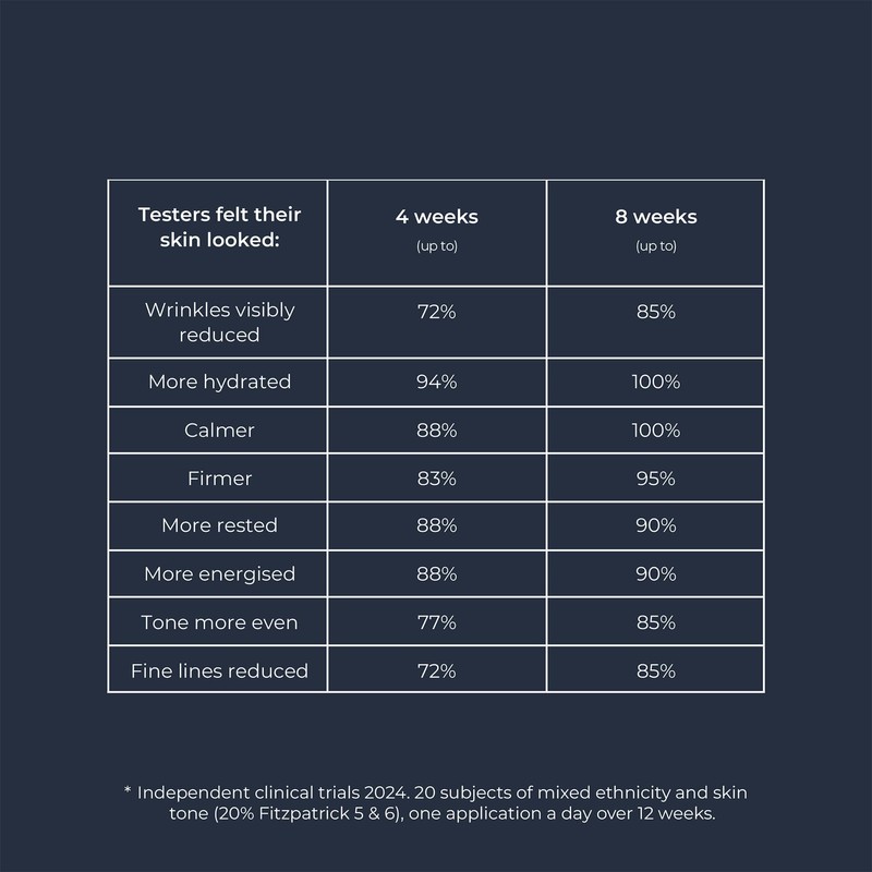 - *Independant Clinical Trials 2024. 20 subjects of mixed ethnicity and skin tone (20% Fitzpatrick 5 & 6).