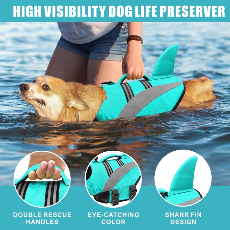 Oslueidy Dog Life Jacket, High Flotation, Shark Dog Life Jacket, Floats Coat, Reflective Pet Safety Vest, Swimsuits, Life Jacket for Swimming, Boating, Surfing, Kayaking