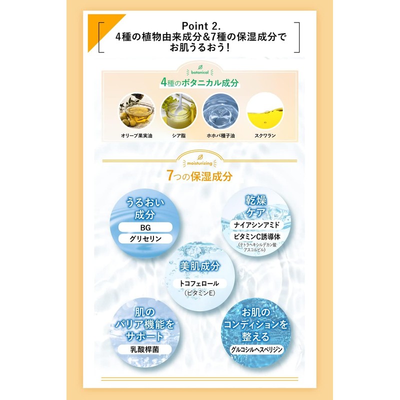 - ⭐ [Ingredients that are gentle on the skin] Contains 4 types of plant-derived ingredients*¹ and 7 moisturizing ingredients*² to moisturize your skin. *¹ Olive fruit oil/Shea butter/Jojoba seed oil/Squalane *² BG/Glycerin/Niacinamide/Vitamin C derivative/Tocopherol/Lactobacillus/Glucosyl hesperidin