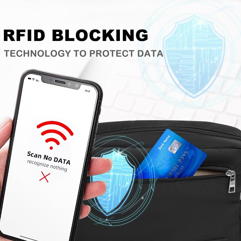 - đăMultiple PocketsăThe belt bag comes with 1 front RFID zipper pocket, 1 main zipper compartment (with 3 inner pockets), 1 back zipper anti-theft pocket, and 1 earphone hole. Practical compact multiple pockets to classify your personal stuff, enough space for you to hold phone, keys, wallet, tissues, credit card and and other small items.