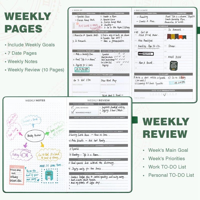 - Undated, Luxurious & Premium Quaility - The planner comes undated so you can start any time of the year without wasting a page. 7 months capacity runs in bulk and are separated into weeks and days.3 colorful bookmarks to flip between weekly and monthly spreads. The hardcover is made from skin-friendly faux leather with unique artwork engraved, a convenient pen holder, elastic band, and totally 384 decorative stickers and 12 index stickers.
