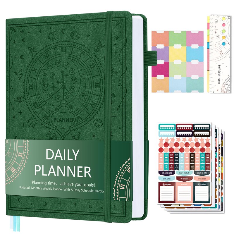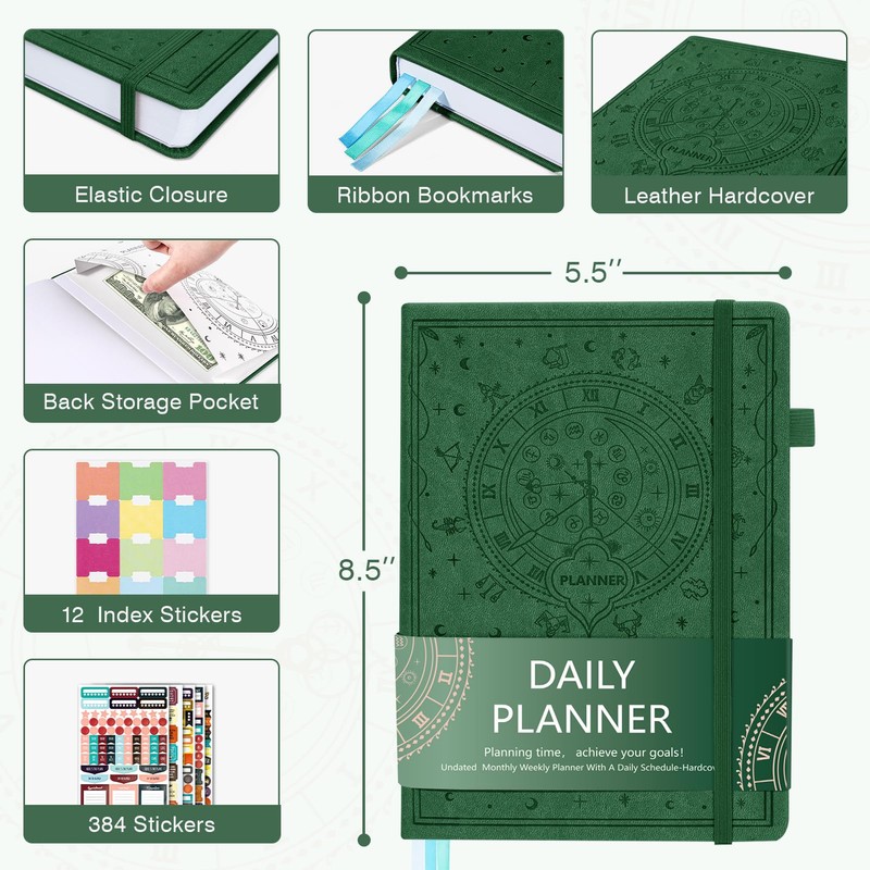 Ospelelf 2025 Leather Undated Daily Planner 2024-2025 (5.5 x 8.5''), Weekly & Monthly Life Planner, Organizer Notebook & Productivity Journal. A5 Hardcover with Stickers(Dark Green)
