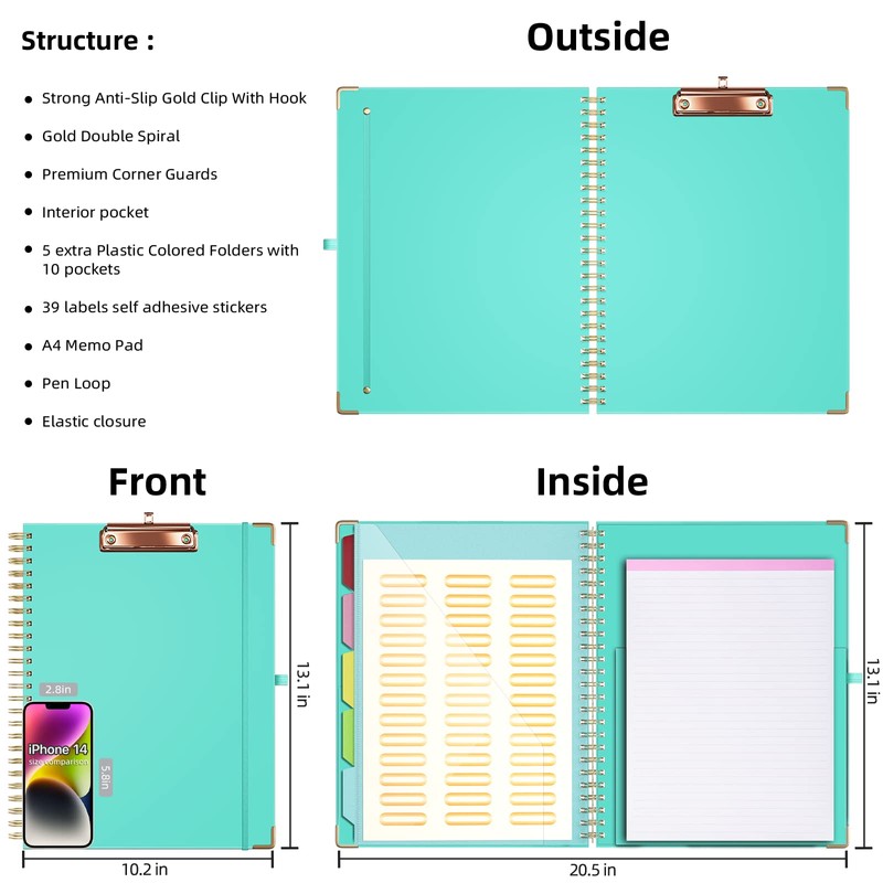 - 【Stay Organized】 Features interior pocket to store letter size papers and important loose documents. Clipboard comes with 5 extra Plastic Colour Folders with 10 pockets fit in all standard US letter size sheets(11*8.5''), plus 72 file folder labels self adhesive stickers for organized use.