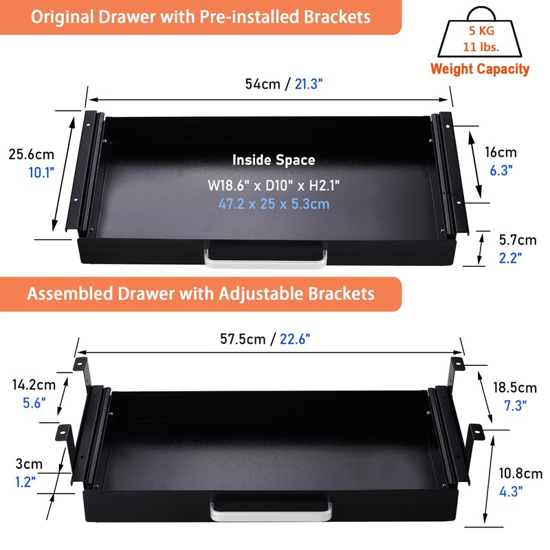 - Config & Specifics: Table Thickness: At Least 0.75”/18mm.The internal DIMs (WxDxH) of the under shelf drawer pull out are 18.6" x 10" x 2.1" / 47.2 x 25 x 5.3cm. The metal drawer is made of high quality steel, solid workmanship, the surface is orange peel texture, wear resistant and easy to scrub.