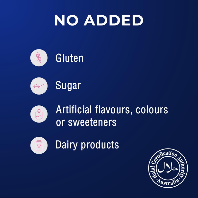 - NO ADDED: Gluten, lactose, sugar, artificial colours, artificial flavours, artificial sweeteners, or dairy products