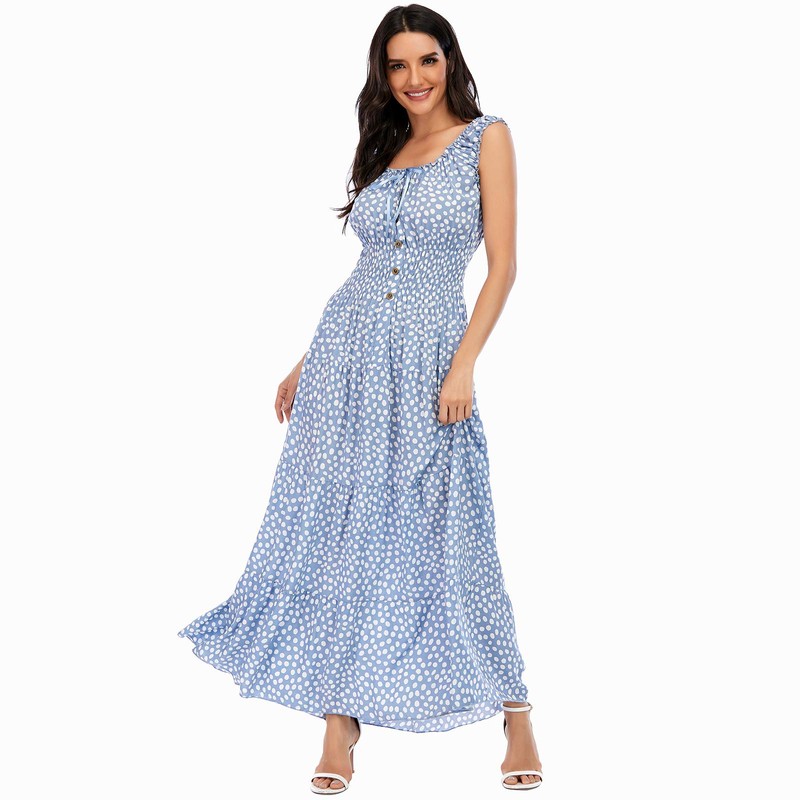 - Bohomian Maxi Dress Design - Sleeveless ruffle sleeve hole and collar with buttons decorating on the central front, A-line style with flowy hem, as a boho beach dress for your vacation and daily wearing.