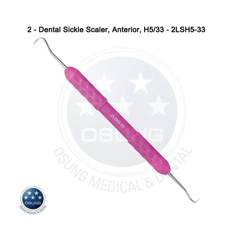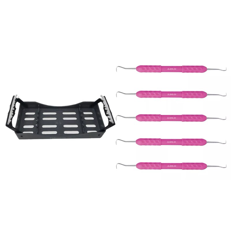 Set of 5 Sickle scalers. These scalers have sharp edges on both sides to remove calculus in anterior. Pointed tip end. Comes with storage and sterilization cassette. Excellent quality. Silicone Handle for comfortable holding in hand to prevent fatigue. Autoclavable.