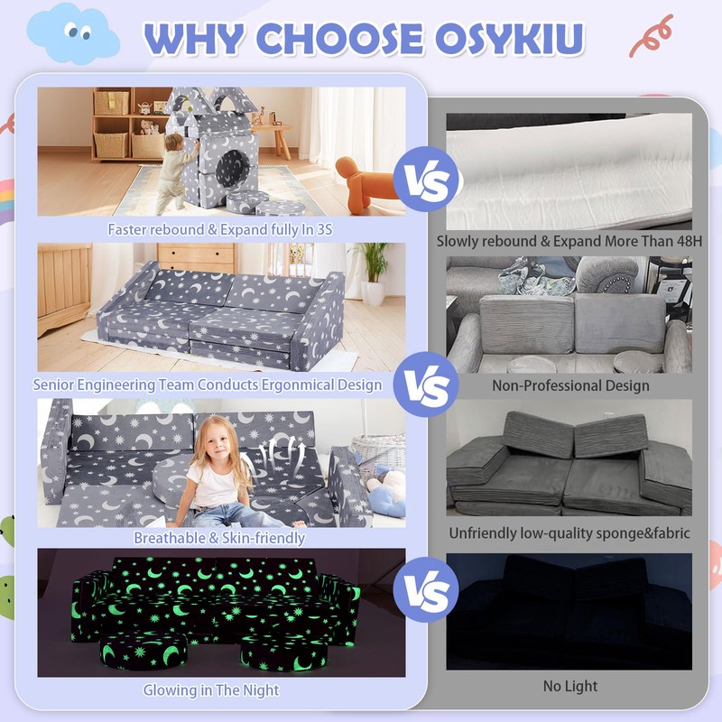 - 12Pcs Modular DIY Design: OSYKIU modular kids play couch offers 6 different shapes and 12 foam pieces for DIY unlimited builds.They are not only for sitting and lying, but also can be built into a variety of vivid and interesting builds, for example playhouse, cabriolet, castle, slides, tent, church, tunnel, bed lounge or anything that your children can imagine, More than 300 DIY creation builds for lots of fun and entertainment.