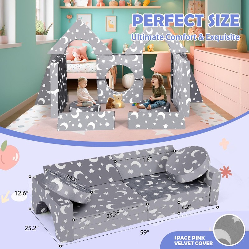 - Stylish Design and Top-notch Materials: According to children's play preferences and educational concepts, Our outstanding designers developed this various shapes modular toddler couch that promotes children's entertainment and education in all aspects. Premium materials such as sturdy high-density foam and velvet cover make the kids sofa comfortable, durable and safe.