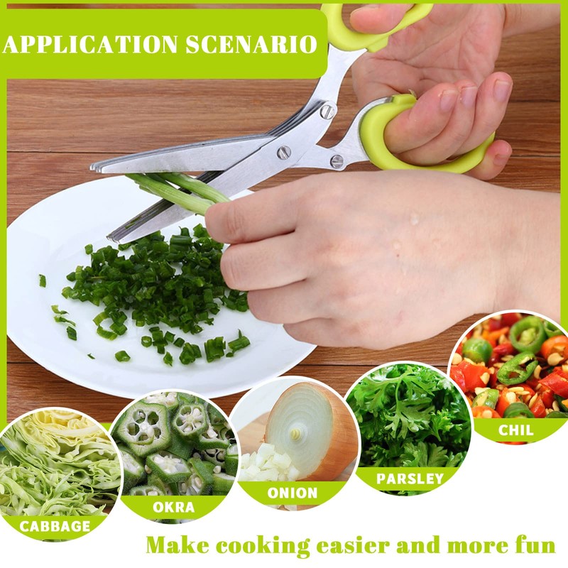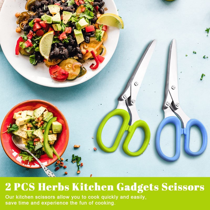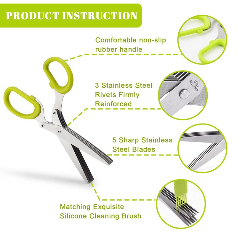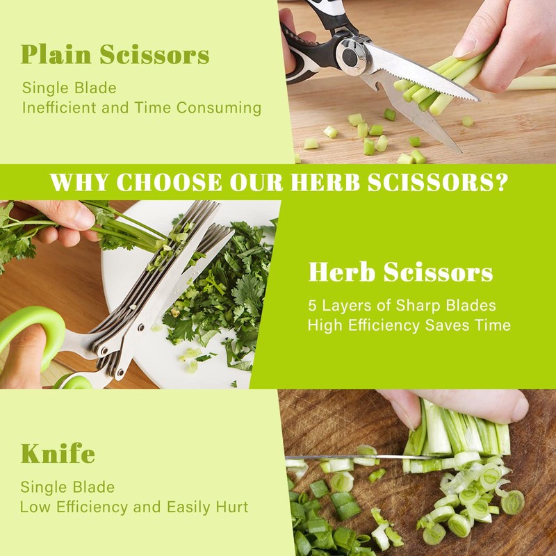 - Multifunctional scissors: the 5-blade herb scissors efficiently cut vegetables and herbs and are also perfect for preparing fine food. Whenever you need to cut refined ingredients like chili, seaweed, mint, rosemary, parsley and basil, these kitchen herb scissors are up to the task. It is also great for chopping confetti.
