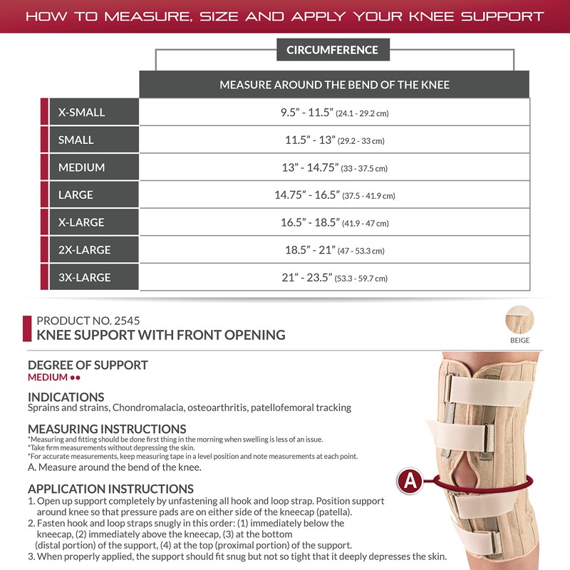 - Measure around the bend of the knee. Available Sizes: X-Small (9.5-11.5 Inches), Small (11.5-13 Inches), Medium (13-14.75 Inches), Large (14.75-16.5 Inches), X-Large (16.5-18.5 Inches), 2X-Large (18.5-21 Inches), and 3X-Large (21-23.5 Inches).