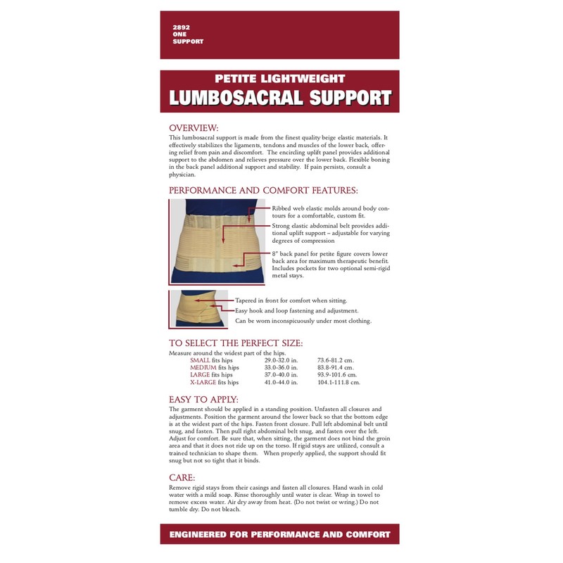 OTC brand (model 2892) petite lumbo-sacral support. Encircling uplift panel provides additional support to the abdomen and relieves pressure over the lower back; Flexible boning in the back panel provides additional support and stability