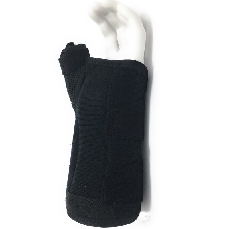 - Removable pre-shaped metal splint and radial stay hold wrist and thumb in a position to promote healing.