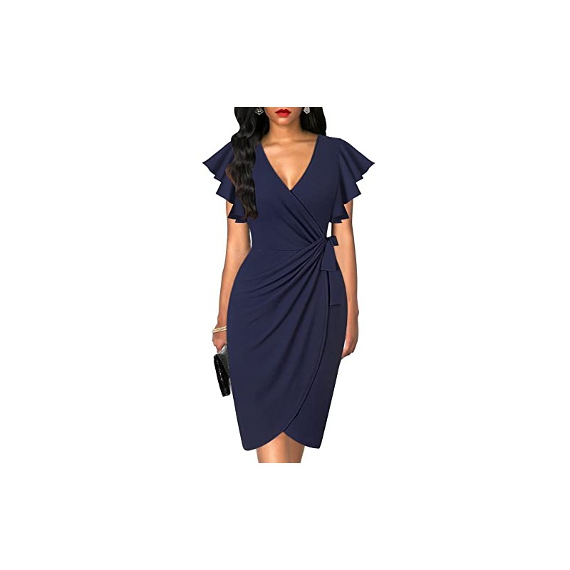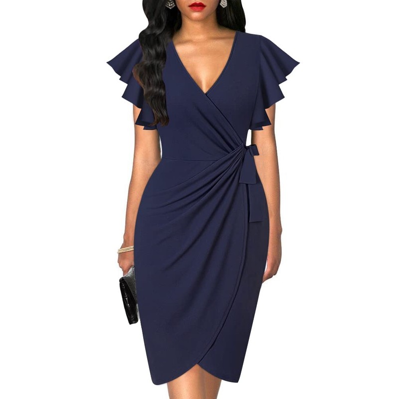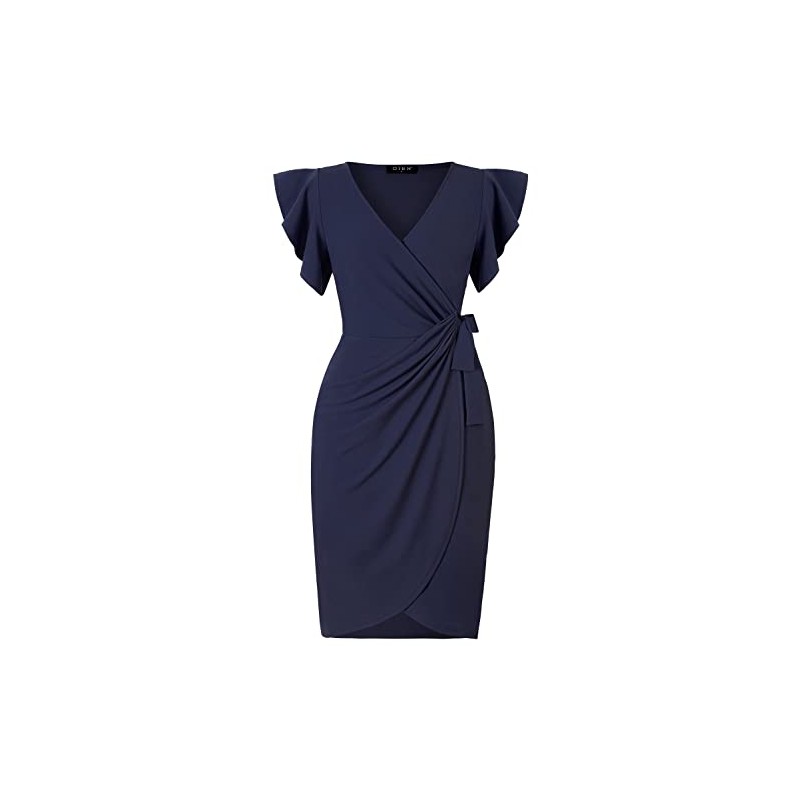 oten Womens Deep V Neck Ruffle Sleeve Sheath Casual Cocktail Party Work Faux Wrap Dress Navy Blue Medium