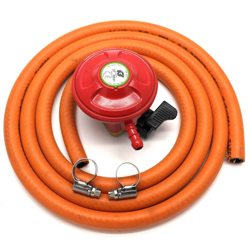 - 1 X PATIO GAS REGULATOR , 37mbar PROPANE , WITH 27mm CLIP ON FITTING , 2mt High Pressure 8mm Hose , 2 x hose clips