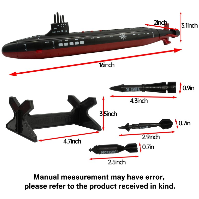 - MILITARY SUBMARINE TOY🌊 Meticulously crafted submarine toy, scaled down and restored to the same proportions as a real one.All black with red background, equipped with a torpedo and two missiles.