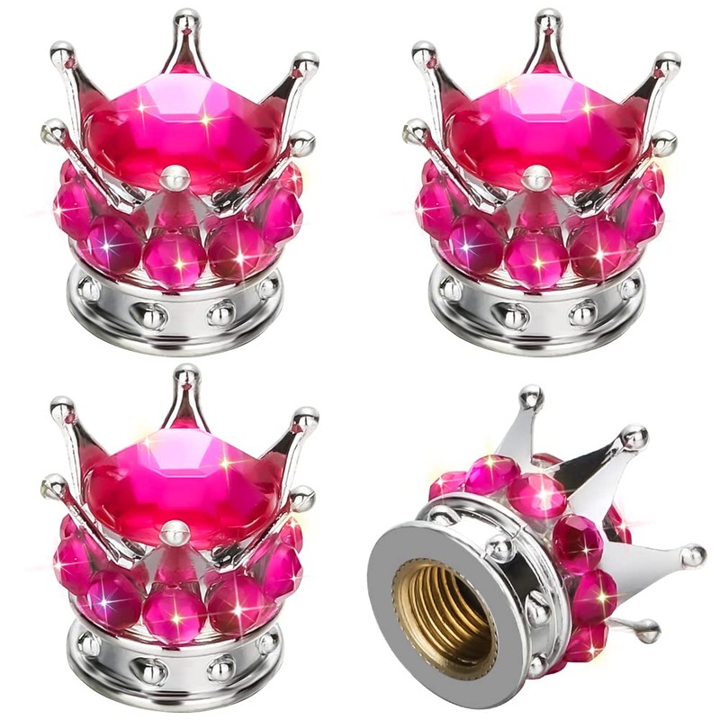 OTOSTAR Bling Tire Valve Stem Caps, 4 Pack Pure Handmade Rhinestones Universal Crown Car Wheel Tire Valve for Car, Bicycle, Motorcycle, Attractive Dustproof Bling Car Accessories (Silver/Hot Pink)
