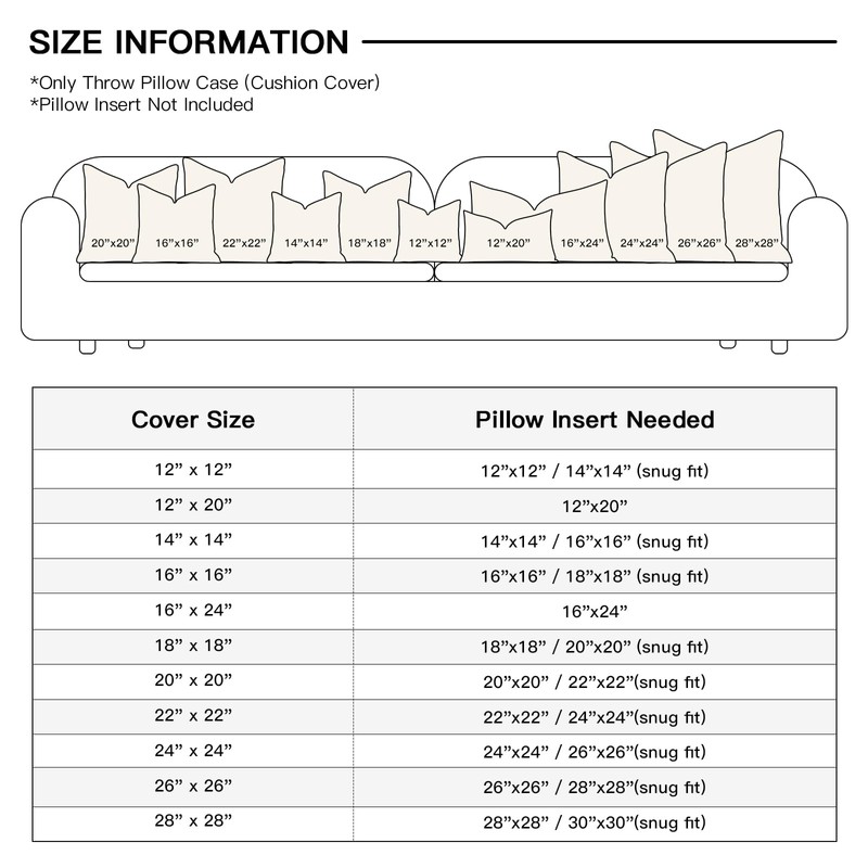 Pillow cover size : 12x12inch 12x20inch 14x14inch 16x16inch 16x24inch 18x18inch 20x20inch 22x22inch 24x24inch 26x26inch 28x28inch