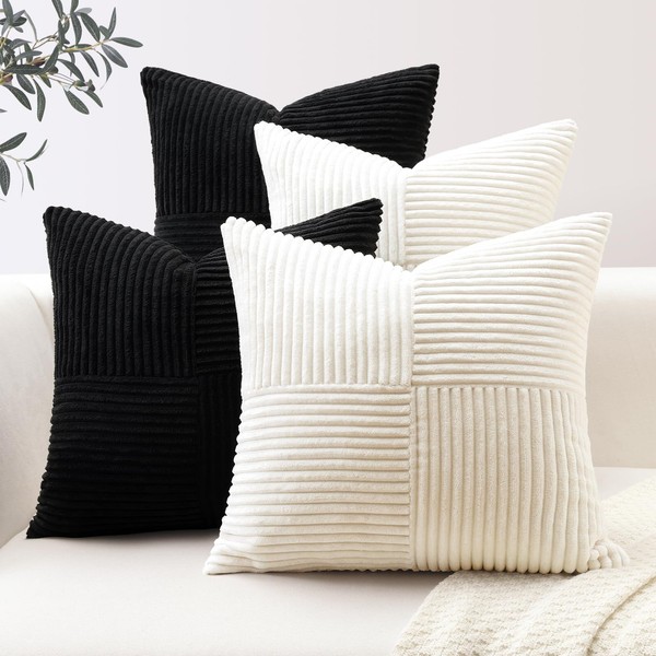OTOSTAR Set of 4 Decorative Throw Pillow Covers 18x18 Inch Striped Corduroy Square Pillow Cases with Invisible Zipper for Couch Sofa Living Room Bedroom Black Cream White Mix and Match Home Decor