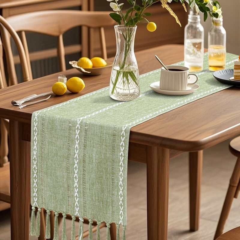 OTOSTAR Table Runner with Tassels 13x108 Inch Rustic Farmhouse Table Runners Boho Hemstitched Embroidered Table Runner 108 Inches Long Rustic Home Holiday Party Dining Decor (Sage Green)