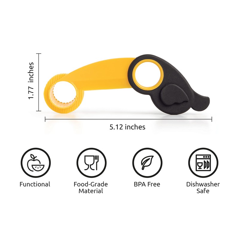 - 黄色い丸い部分で、芯の部分に上から差し込み、くるくると回すと螺旋状にリンゴをスライスし、同時に芯もくりぬきます!