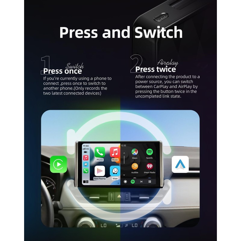 - It allows for quick and effortless switching between CarPlay, Android Auto, and AirPlay functionalities with a simple press of a button.