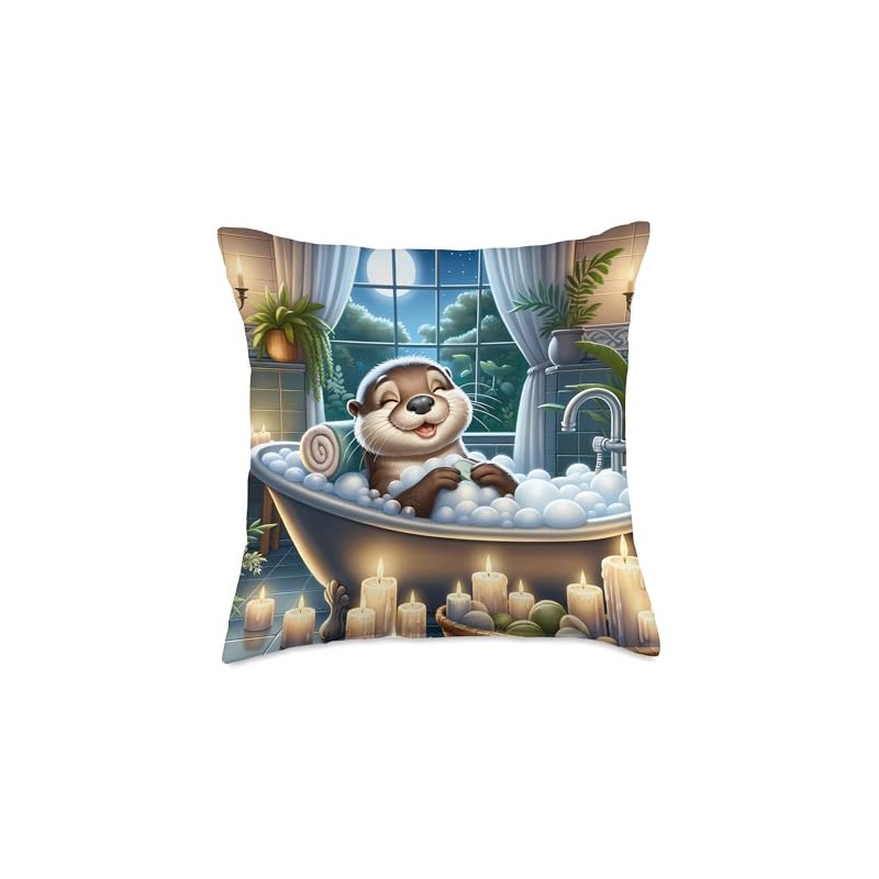 Otter Enjoying A Bubble Bath. Candles Pampering Peaceful Throw Pillow