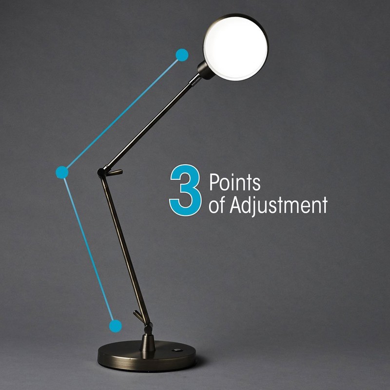 - VERSATILE: Use this stylish, all-metal light on your desktop, table or nightstand. The arm, with two adjustable knobs and a swiveling joint at the shade, can be moved at three different positions from 5.5” to 24” and has a 7.13” diameter base.